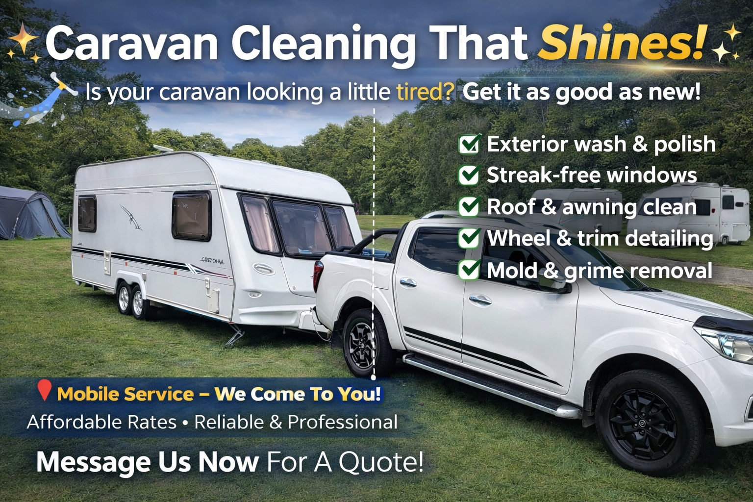 We specialise in caravan cleaning, offering a full exterior wash and polish, streak-free window cleaning, roof and awning cleaning, wheel and trim detailing, and complete removal of mould and grime—leaving your caravan looking as good as new.